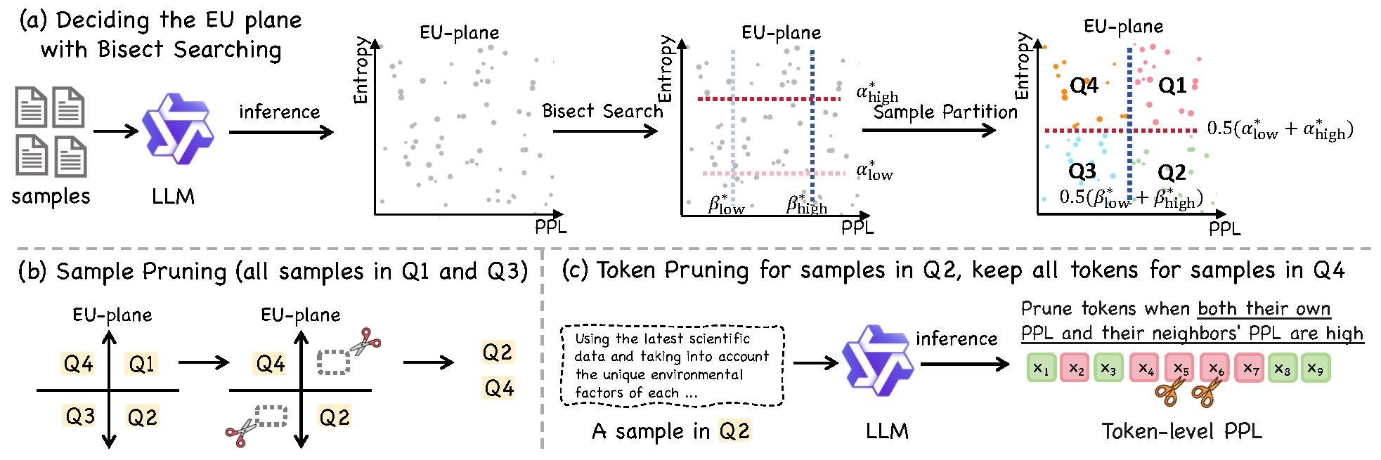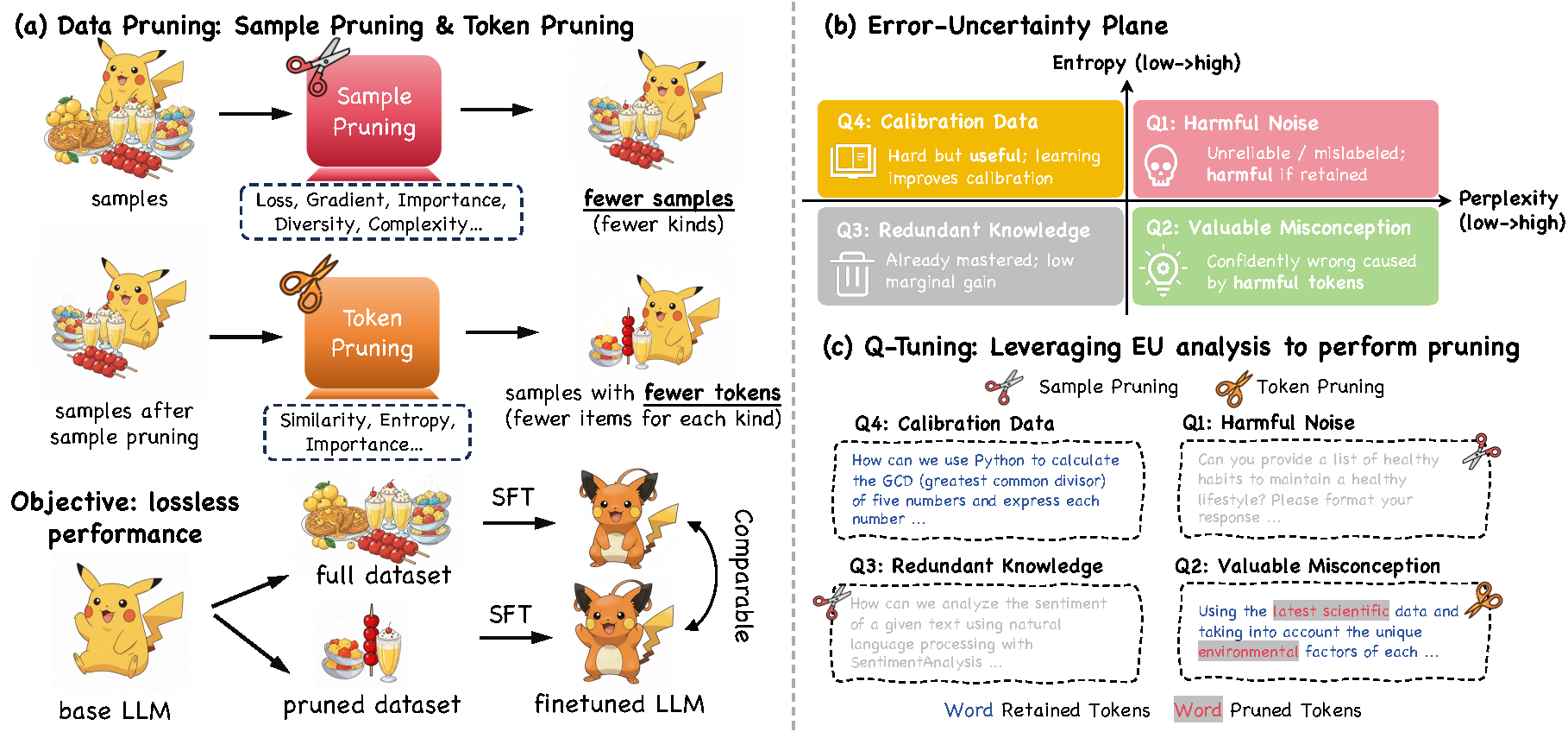 TL;DR: As supervised fine-tuning (SFT) evolves from a lightweight post-training step into a compute-intensive phase rivaling mid-training in scale, data efficiency has become critical for aligning large language models (LLMs) under tight budgets. Existing data pruning methods suffer from a fragmented design: they operate either at the sample level or the token level in isolation, failing to jointly optimize both dimensions. This disconnect leads to significant inefficiencies—high-value samples may still contain redundant tokens, while token-level pruning often discards crucial instructional or corrective signals embedded in individual examples. To address this bottleneck, we introduce the Error–Uncertainty (EU) Plane, a diagnostic framework that jointly characterizes the heterogeneous utility of training data across samples and tokens. Guided by this insight, we propose Quadrant-based Tuning (Q-Tuning), a unified framework that strategically coordinates sample pruning and token pruning. Q-Tuning employs a two-stage strategy: first, it performs sample-level triage to retain examples rich in informative misconceptions or calibration signals; second, it applies an asymmetric token-pruning policy, using a context-aware scoring mechanism to trim less salient tokens exclusively from misconception samples while preserving calibration samples in their entirety. Our method sets a new state of the art across five diverse benchmarks. Remarkably, on SmolLM2-1.7B, Q-Tuning achieves a +38% average improvement over the full-data SFT baseline using only 12.5% of the original training data. As the first dynamic pruning approach to consistently outperform full-data training, Q-Tuning provides a practical and scalable blueprint for maximizing data utilization in budget-constrained LLM SFT.