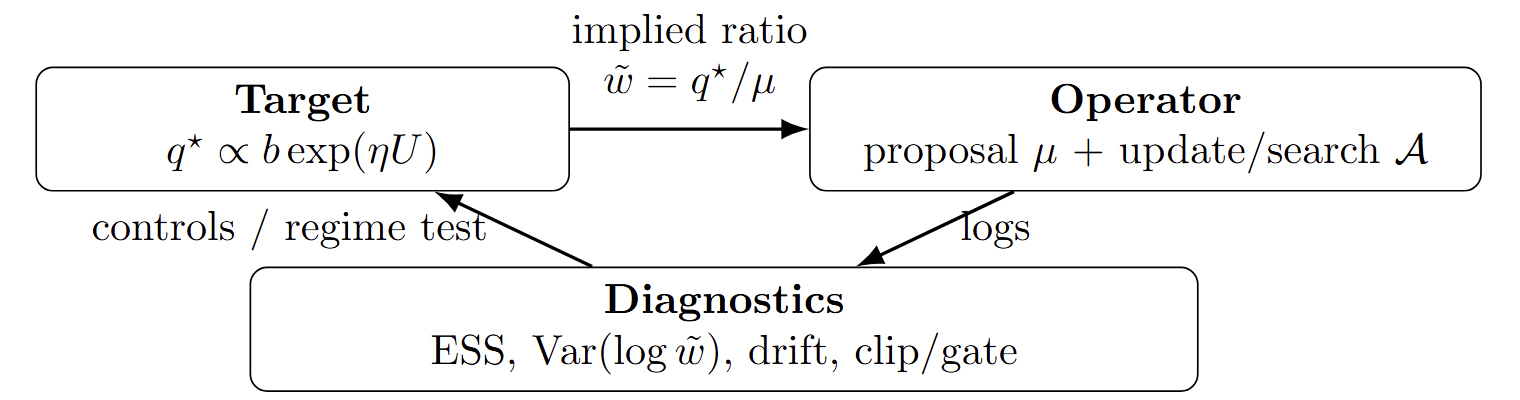 In later sections, when we discuss regimes and operator swaps, we will always refer back to descriptions of this form: fixed target, specified proposal \(\mu\) , specified action \(\mathcal{A}\) , and diagnostics computed from the induced weights \(\tilde w\) . This makes statements about equivalence or divergence precise, rather than being tied to method names.