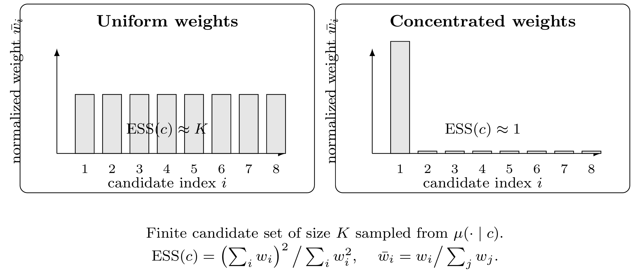 \[\small \mathrm{ESS}(c) = \frac{1}{\sum_{i=1}^K \bar w_i^2} = \frac{\left(\sum_{i=1}^K w_i\right)^2}{\sum_{i=1}^K w_i^2}.\]This quantity always lies between \(1\) and \(K\) . If all weights are equal, \(\bar w_i = 1/K\) for all \(i\) , then \(\mathrm{ESS}(c) = K\) , meaning that all samples contribute equally. If a single weight dominates, \(\bar w_i \approx 1\) for some \(i\) , then \(\mathrm{ESS}(c)\) is close to \(1\) , meaning that, in effect, only one sample is informative for the target.