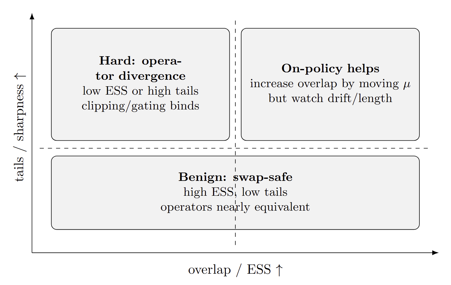 \[\tilde w(y,c) = \frac{q^*(y \mid c)}{\mu(y \mid c)}\]and that simple diagnostics derived from this ratio are enough to distinguish regimes where operators are effectively interchangeable from regimes where they are not. When the proposal \(\mu\) has good overlap with \(q^*\) and the induced importance weights have moderate tails, different operators that share the same target tend to produce similar outcomes under matched compute. When overlap deteriorates or the target becomes very sharp, the induced weights become heavy-tailed, and details of the operator-on- versus off-policy sampling, token- versus sequence-level objectives, clipping versus gating-have a large and systematic effect [11,17,12,18,5,10].