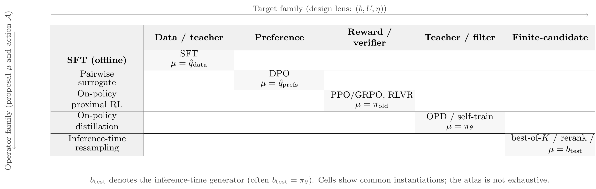 For example, a cell combining a preference-induced target and an off-policy surrogate operator corresponds to DPO-style methods. A cell combining a two-anchor reward-tilted target and a proximal RL operator corresponds to PPO/GRPO-style RLHF. A cell combining the same target with a test-time search operator corresponds to best-of- \(K\) or reranking schemes that act only at inference. On-policy distillation populates cells where the target is teacher-driven and the operator is an on-policy projection based on student rollouts.